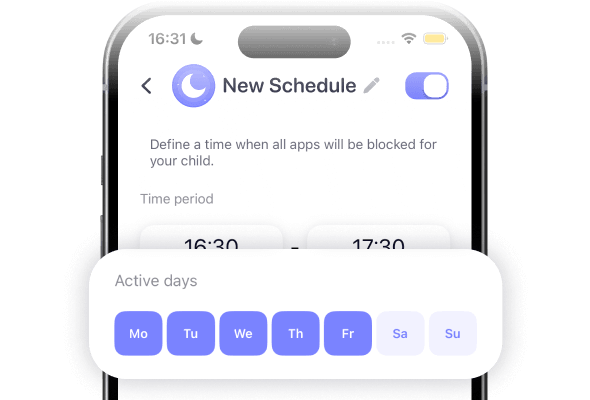 Schedules are a powerful tool for creating screen-free time blocks in your child's day. You can use them to automatically block distracting apps during important activities like homework, dinner, or bedtime, helping your child build healthy digital habits.