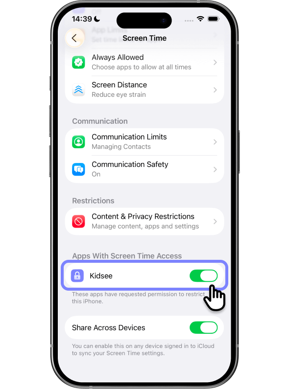 3. Scroll down to the Apps With Screen Time Access section. Find Kidsee and make sure its permission is toggled on. If it's already on, toggle it off and then on again to reset the connection.